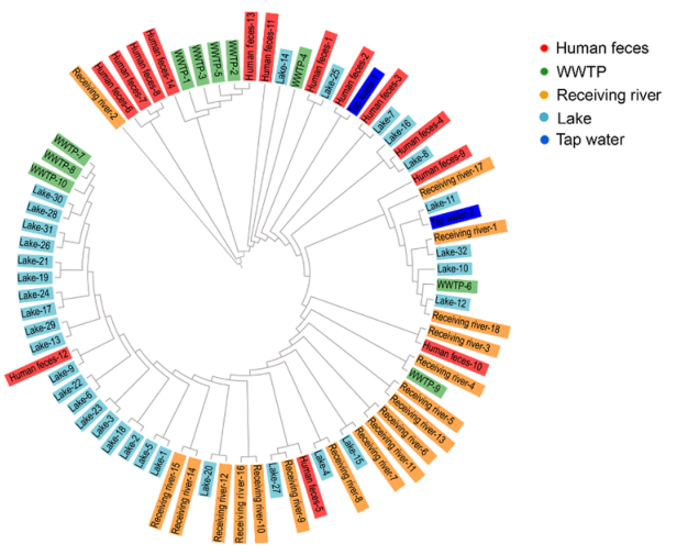 除了crAssphage 之外,研究者通過(guò)構(gòu)建系統(tǒng)發(fā)育樹(shù)分析了來(lái)自所有樣品的氨芐青霉素抗性菌株中的 blaTEM-1基因序列(圖4)。結(jié)果表明,來(lái)自四種環(huán)境樣品(湖水、自來(lái)水、污水處理廠和受納河水)的blaTEM-1與腸道樣品的進(jìn)化關(guān)系密切(圖4)。該結(jié)果表明blaTEM-1可能通過(guò)污水排放在人類(lèi)糞便和受納水體之間進(jìn)行傳播。然而,需要進(jìn)一步的研究來(lái)驗(yàn)證這些發(fā)現(xiàn)。
