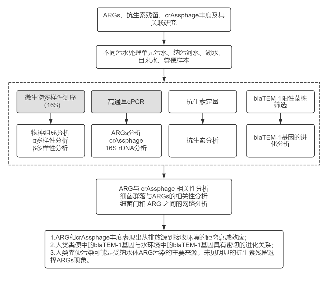 環(huán)境中細(xì)菌的抗生素耐藥性由于與臨床病原體的抗生素耐藥性密切相關(guān)而受到越來(lái)越多的關(guān)注。自從人類(lèi)在臨床上使用抗生素以來(lái),環(huán)境中的抗生素耐藥基因(ARGs)亦有所增加。然而,這種增加是否直接來(lái)源于環(huán)境殘留抗生素的選擇性壓力還是來(lái)源于人類(lèi)大量排放的糞便污染卻不得而知。在該項(xiàng)研究中,調(diào)查了人類(lèi)糞便以及受人類(lèi)糞便污染影響的不同污水處理廠受納水環(huán)境中的 ARGs、crAssphage 和抗生素殘留特征,以期了解抗生素的選擇壓力和人類(lèi)糞便污染對(duì)受納水體ARGs污染的影響。
