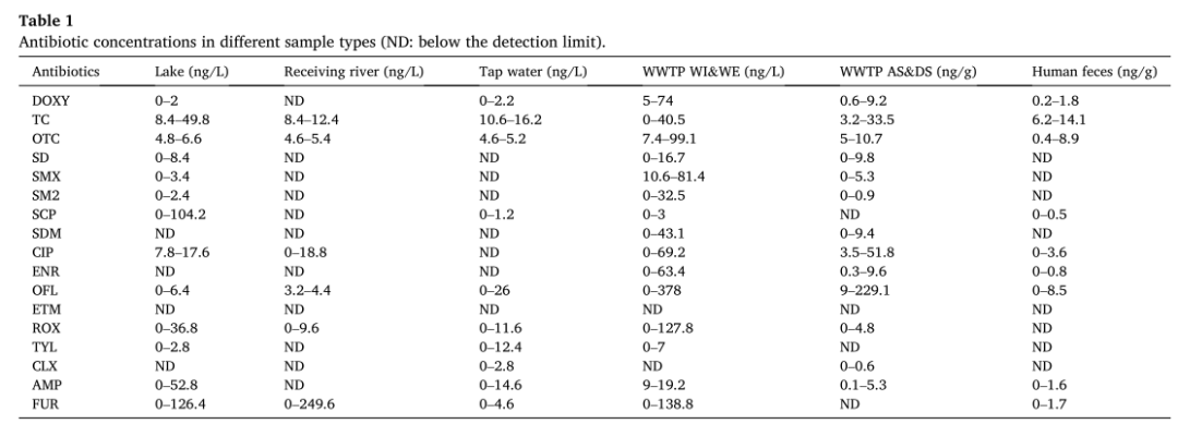 表1.不同樣品類(lèi)型中的抗生素濃度(ND:低于檢測(cè)限值)。