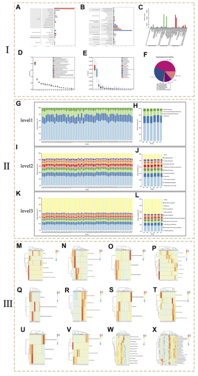 圖5.宏基因組測序結(jié)果。 (Ⅰ:功能注釋分析。Ⅱ:KEGG通路組成和豐度直方圖。Ⅲ:metagenomeSeq差異通路豐度熱圖)。