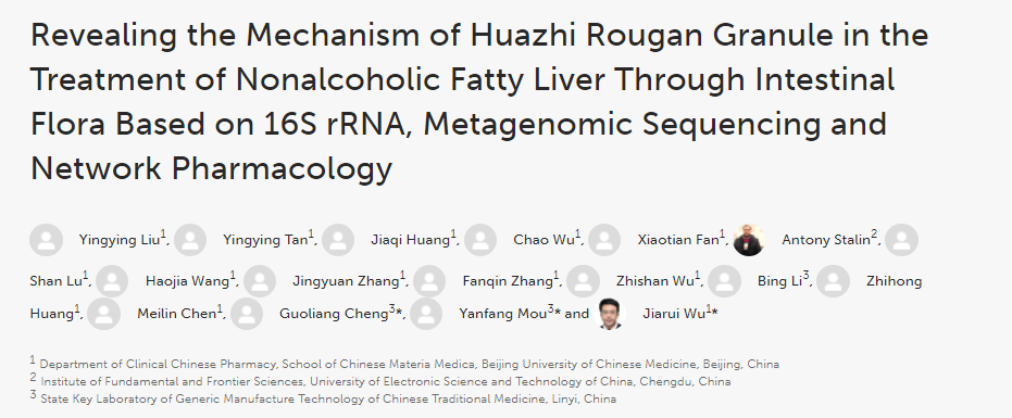 Liu Y, Tan Y, Huang J, et al. Revealing the Mechanism of Huazhi Rougan Granule in the Treatment of Nonalcoholic Fatty Liver Through Intestinal Flora Based on 16S rRNA, Metagenomic Sequencing and Network Pharmacology[J]. Frontiers in pharmacology, 2022, 13.