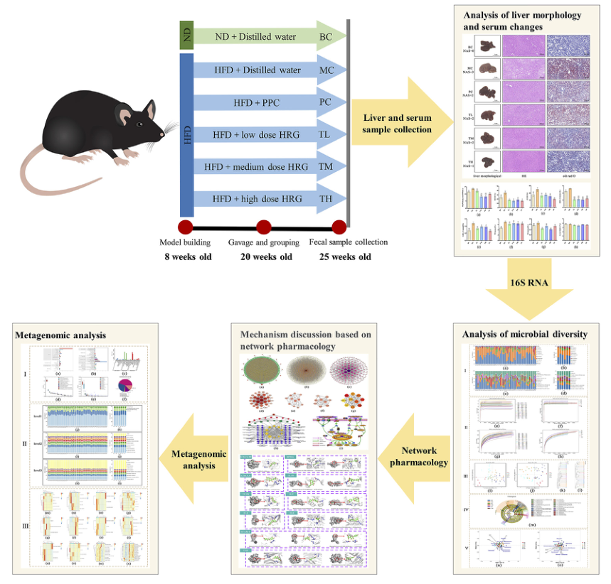 綜上所述,HRG可能通過改變微生物多樣性、結(jié)構(gòu)和功能來改善高脂飲食誘導(dǎo)的NAFL。還有可能通過調(diào)節(jié)腸道相關(guān)的代謝途徑、炎癥反應(yīng)和免疫反應(yīng)來改善NAFL相關(guān)的脂肪堆積和肝臟損傷。這些結(jié)果有力地表明,HRG可能通過預(yù)防腸道菌群失調(diào)來減輕NAFL。此外,HRG可通過腸道菌群治療多種成分、多代謝途徑、多靶點(diǎn)的NAFL。本研究為NAFL的治療提供了新的思路,證實(shí)了腸道菌群與NAFL之間的關(guān)系,提示HRG具有良好的治療效果。