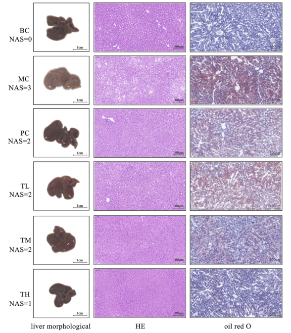 如圖1所示,與BC組相比,模型組大鼠肝臟脂肪堆積增多,肝臟體積增大,顏色變白,邊緣變鈍。給藥后,各組大鼠肝臟紅化程度均有不同程度的改善,尤以TH組為佳。HE和油紅O染色結(jié)果顯示,模型組大鼠肝組織內(nèi)可見較多的球狀變性肝細(xì)胞和較多的紅色脂肪,而給藥組較少。MC組病理程度重,TH組輕,TL組與PC組之間無顯著差異。因此,HRG可改善HFD誘導(dǎo)的肝臟脂肪堆積和體重增加,并且可能以劑量依賴的方式改善肝臟損傷。