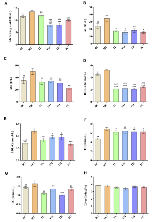 TM組和TH組降低AKP效果優(yōu)于TL組,TG組降低AKP效果優(yōu)于TM組。PC組降低AKP的效果優(yōu)于TL組,但差于TM組和TH組。PC組降低低密度脂蛋白膽固醇的效果優(yōu)于TM組和TH組,表明高脂飼料可導(dǎo)致大鼠血脂和肝酶代謝異常,高脂高脂顆??筛纳聘咧笫笱x和肝酶活性。與陽性藥物相比,HRG在改善高密度脂蛋白膽固醇、甘油三酯、堿性磷酸酶方面具有優(yōu)勢,且改善程度可能呈劑量依賴性。各組間器官指數(shù)無顯著差異,HRG對小鼠生化指標(biāo)和器官指數(shù)的影響如圖2所示。