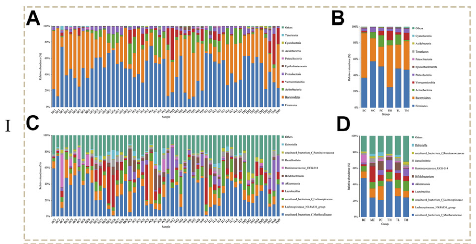 對糞便樣本進(jìn)行16s rRNA基因測序分析,在門、綱、目、科和屬的水平上對微生物群進(jìn)行了鑒定和分析,最終共鑒定到17門、26綱、56目、86科、187屬。主要物種為厚壁菌門和擬桿菌門,其次是放線菌門、疣微菌門和變形菌門。此外,物種主要分布在uncultured_bacterium_f_Muribaculacea屬和lachnospiraceae NK4A136 group,其次是uncultured_bacterium_f_Lachnospirae、Lactobacillus和Akkermansia。