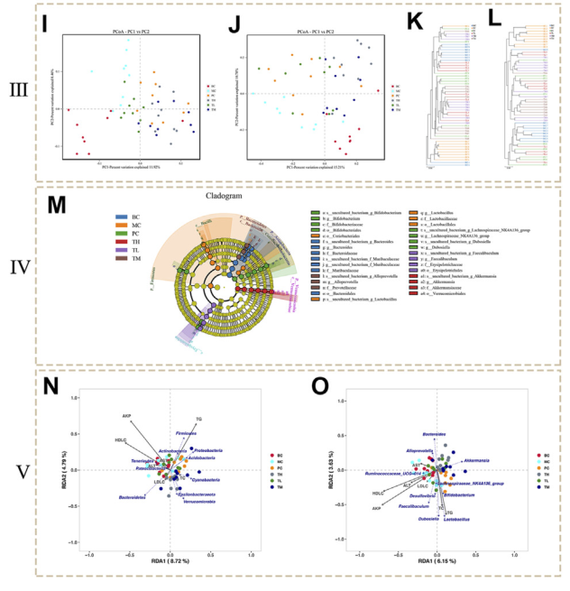 腸道菌群聚類顯示BC組和MC組樣本微生物群落差異明顯,給藥組、BC組和MC組微生物群落差異顯著。此外,Bray-Curtis PCoA 證實(shí)了這些發(fā)現(xiàn)(圖 3J)Curtis PCoA 證實(shí)了這些發(fā)現(xiàn)(圖 3J)。 PC1(15.21%)能較好地區(qū)分BC和MC組、MC和TM、TH組微生物群落。這些數(shù)據(jù)進(jìn)一步表明BC和MC組在微生物群落結(jié)構(gòu)上存在較大差異,并且HRG施用組和對照組在微生物群落結(jié)構(gòu)上存在較大差異。