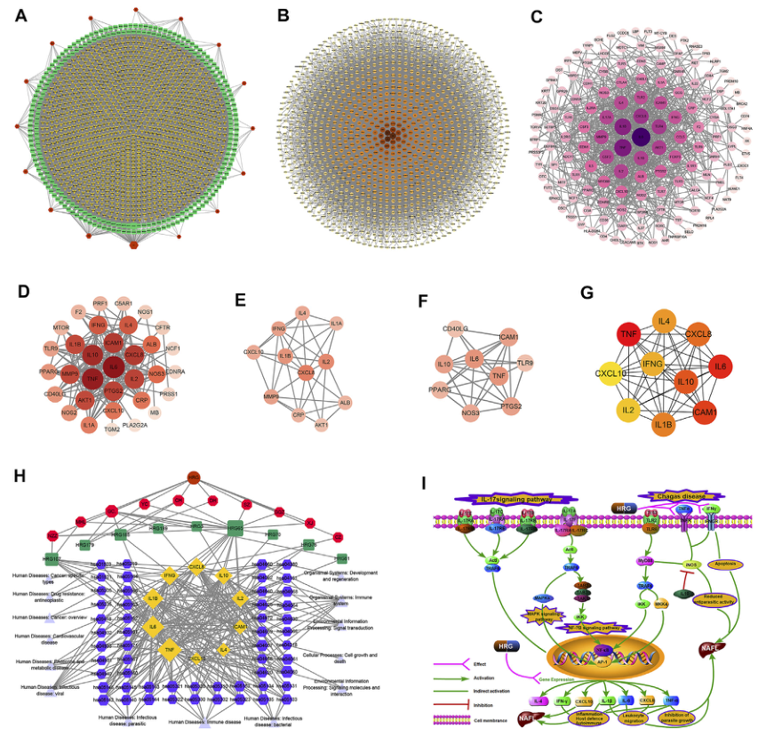 (A)HRG藥材靶點(diǎn)網(wǎng)絡(luò)。(B)與NAFL有關(guān)的PPI網(wǎng)絡(luò)。(C)與IFD有關(guān)的PPI網(wǎng)絡(luò)。(D)HRG-IFD-NAFL合并目標(biāo)的PPI網(wǎng)絡(luò)。(E)模塊1(F)模塊2(G)Hub基因。(H)草藥-關(guān)鍵化合物-潛在靶向途徑網(wǎng)絡(luò)。(I)關(guān)鍵靶點(diǎn)可能導(dǎo)致的關(guān)鍵生物進(jìn)展圖例。