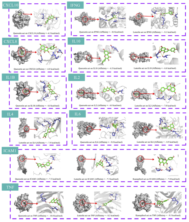 利用10個關(guān)鍵治療靶點(diǎn)、14個關(guān)鍵化合物和相關(guān)通路,通過Cytoscape構(gòu)建了“藥草-關(guān)鍵化合物-潛在靶點(diǎn)-通路”的網(wǎng)絡(luò)圖(圖4H)。排名前三的化合物被選為潛在化合物(槲皮素、木犀草素、山柰酚)。選擇前三個信號通路作為關(guān)鍵通路。繪制了 HRG 通過腸道菌群治療 NAFL 的通路機(jī)制(圖 4I)。將10個關(guān)鍵靶點(diǎn)與3個潛在化合物進(jìn)行分子對接,共獲得18對對接結(jié)果(表4),使用 Pymol 可視化結(jié)果(圖 5)。