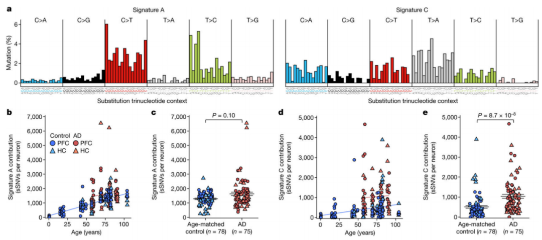 對(duì)從AD和神經(jīng)典型對(duì)照個(gè)體的大腦中分離出來(lái)的神經(jīng)元進(jìn)行了單細(xì)胞全基因組測(cè)序(scWGS),染色了泛神經(jīng)元標(biāo)記NeuN來(lái)標(biāo)記神經(jīng)元,并進(jìn)一步只標(biāo)記了大的NeuN陽(yáng)性核,使用多位移放大(MDA)進(jìn)行全基因組擴(kuò)增,分析了8例AD的91個(gè)神經(jīng)元和18個(gè)神經(jīng)典型對(duì)照組的159個(gè)神經(jīng)元。在神經(jīng)典型個(gè)體中,神經(jīng)元sSNVs隨著年齡的增長(zhǎng)而增加,sSNVs的年增長(zhǎng)率相當(dāng)高,從每年13到55個(gè)sSNV不等,在一些特殊細(xì)胞類(lèi)型中,分裂突變率更高。沒(méi)有神經(jīng)診斷的個(gè)體的海馬CA1神經(jīng)元顯示,隨著年齡的增長(zhǎng),sSNVs呈積累的趨勢(shì),這與神經(jīng)典型對(duì)照個(gè)體前額葉皮層(PFC)神經(jīng)元中看到的sSNV的增加沒(méi)有顯著差異。