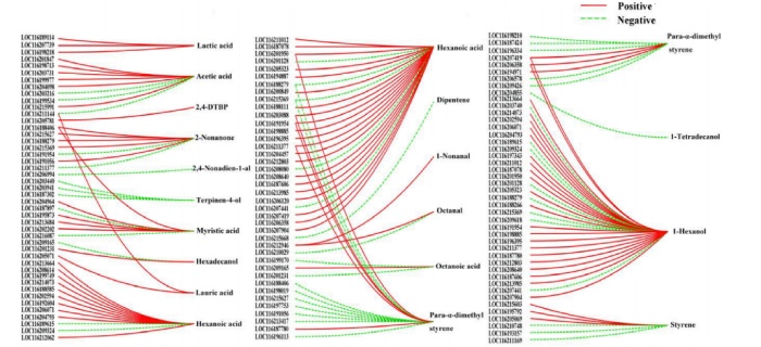 相關(guān)性網(wǎng)絡(luò)圖:己酸和1-己醇是石榴果實(shí)中的關(guān)鍵揮發(fā)性化合物,分別與38個和31個DEGs顯著相關(guān),例如Para-α-二甲基苯乙烯、2-非丙酮、肉豆蔻酸、苯乙烯和乙酸與不少于5個DGE具有顯著的高相關(guān)性。結(jié)果表明,植物的次級代謝途徑不僅僅是相應(yīng)途徑中酶與底物反應(yīng)的結(jié)果,還受到其他途徑中基因編碼蛋白與代謝物相互作用的影響。