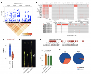 另外,該研究也在14個(gè)FILs中鑒定了PAVs,平均鑒定到16,152個(gè)PAVs和184個(gè)PAV基因(圖3b)。GO富集分析表明,PAV基因在防御反應(yīng)、DNA整合、蛋白質(zhì)磷酸化、萜類生物合成過程、激素介導(dǎo)的信號(hào)通路、細(xì)胞氧化解毒等生物過程中富集。將19個(gè)野生近緣種和23個(gè)地方種的重測(cè)序數(shù)據(jù)與14個(gè)FILs基因組進(jìn)行比對(duì),在至少一份大芻草或地方種質(zhì)中,平均檢測(cè)到93.4%的FIL特異性序列的密切相關(guān)同源物,與之前的報(bào)道一致,這些PAVs中的大多數(shù)都是來源于玉米祖先種中存在的變異。