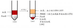 外周血單核細胞(Peripheral blood monoculear cell, PBMC)中大部分都是淋巴細胞(包括B細胞和T細胞),以及少部分的自然殺傷細胞和單核細胞,而紅細胞和血小板沒有細胞核,而粒細胞(granulocytes) 包括中性粒細胞、嗜堿性粒細胞和嗜酸性粒細胞,有多葉核,所以不包括在PBMC中。PBMC的制備采用密度梯度離心法,可通過Ficoll作為密度梯度介,使得不同密度的細胞在對應(yīng)的界面處,然后通過快速離心,實現(xiàn)細胞分離。