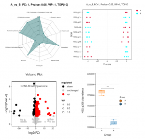 2、Z-score分析:Z-score是基于代謝物的定量值轉(zhuǎn)換而來的值,用于衡量實(shí)驗(yàn)組相對于對照組的差異偏離情況。通過Z-score圖可展示不同兩組間差異代謝物的偏離情況。