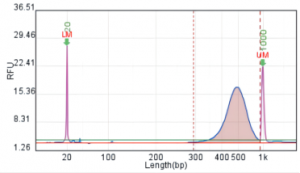純化后的PCR產(chǎn)物,需要進一步濃度和片段大小檢測。其中濃度能達到上機測序要求即可;片段大小必須滿足:片段范圍為300-700bp,主峰在450-550bp;無接頭片段和大片段污染。質檢合格的產(chǎn)物可用于高通量測序。