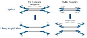 也可根據(jù)接頭是否匹配PCR free建庫的要求,將接頭分為長接頭(完整Y型接頭)和短接頭(非完整Y型接頭)。長接頭包括P5/P7+Index+Read1/Read2序列,可通過TA克隆連接到DNA片段后,形成完整的文庫結構,若文庫產(chǎn)量足量時,可不進行PCR擴增直接上機測序。短接頭只包含Read1/Read2序列,通過TA克隆連接到DNA片段后,需要通過PCR擴增將P5/P7和Index序列引入文庫結構中,形成完整的文庫結構后進行上機測序。