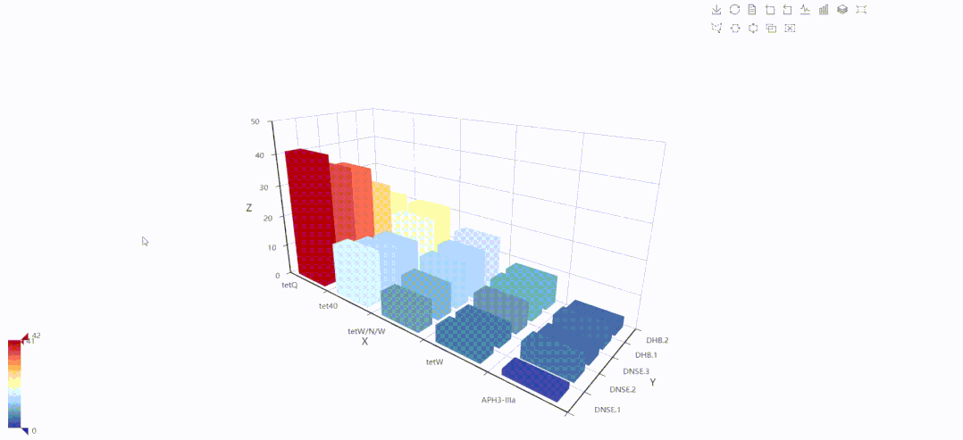 一次繪圖,多圖自由轉(zhuǎn)換。排列柱狀圖、堆疊柱狀圖、排列點線圖、堆疊點線圖、3D柱狀圖等互相自由切換。同時,只需點擊下legend圖例,即可取消掉過多的展示項,從而達到重新繪制的目的。滾動下鼠標(biāo),即可隱藏過多的樣品展示。