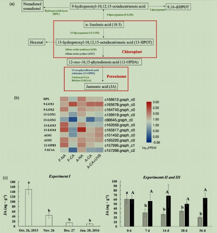 圖4(a)亞麻酸代謝——茉莉酸的生物合成途徑,(b)與這一途徑相關(guān)DEGs熱圖,(c)田間(試驗(yàn)I)和人工(試驗(yàn)II和III)低溫馴化過程中葉片組織JA含量的變化。