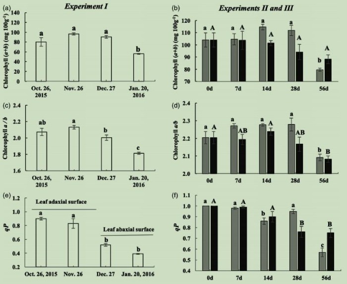 試驗(yàn)I中葉綠素(a+b)含量從10月26日至1月20日(圖5a)降低了30%(圖5a),試驗(yàn)II和III在0-56天處理后分別降低了23%和15%(圖5b)。這表明,隨著溫度的降低,葉片試圖通過降低葉綠素含量來降低光吸收。試驗(yàn)I中,葉綠素a/b在10月26日至1月20日下降了15%(圖5c);試驗(yàn)II和III中,從0-56天分別減少8%和6%(圖5d)。葉綠素a/b的變化表明試驗(yàn)I反應(yīng)中心的降解比試驗(yàn)II和III更嚴(yán)重。代表光系統(tǒng)II反應(yīng)中心開放度的光化學(xué)猝滅(qP)在10月26日至1月20日,降低了57%(圖5e),試驗(yàn)II和III處理0~56天后,qP分別降低了43%和25%(圖5f)。葉綠素(a+b)、葉綠素a/b和qP在試驗(yàn)I中下降得更多,說明光保護(hù)或光抑制作用更明顯。