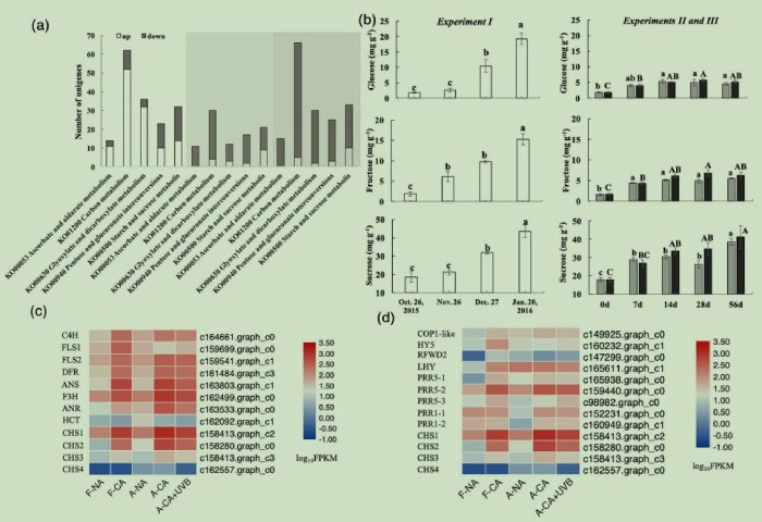 圖6(a)試驗(yàn)I(白色背景)、II(淺灰色背景)和III(深灰色背景)中普遍富集的碳水化合物代謝通路(KEGG通路,p<0.05),(b)試驗(yàn)I、II和III在低溫馴化期間葉片中葡萄糖、果糖和蔗糖濃度的變化,(c)KO00941類黃酮生物合成通路的DEGs熱圖,(d)KO04712植物晝夜節(jié)律通路的DEGs熱圖