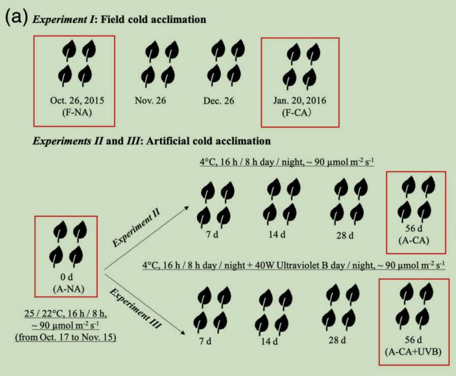 選3年生的“ElsieLee”杜鵑,用于田間或人工低溫馴化試驗(yàn),共3組試驗(yàn):ExperimentI田間低溫馴化(F-CA),ExperimentII人工低溫馴化(A-CA),ExperimentIII人工用紫外光B進(jìn)行低溫馴化(A-CA+UVB)。每組試驗(yàn)36盆,分為3個(gè)生物學(xué)重復(fù),每個(gè)生物學(xué)重復(fù)12盆,采集當(dāng)年生長(zhǎng)的完全展開的葉子進(jìn)行實(shí)驗(yàn),葉片在抽樣日期收集后立即在液氮中冷凍,然后-80℃保存。