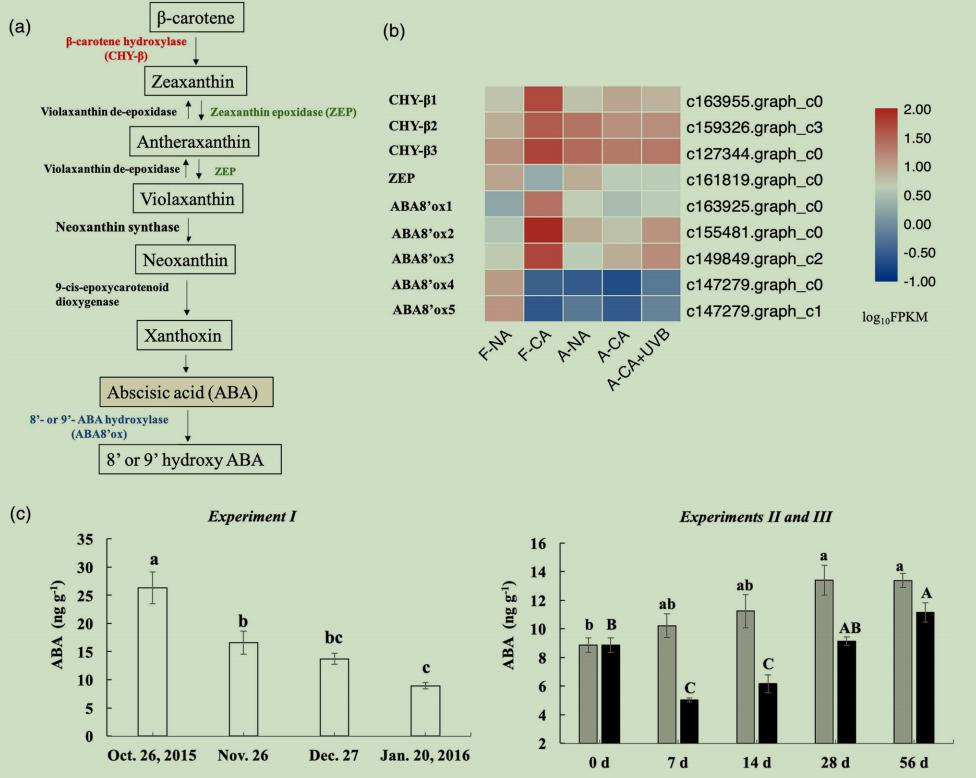 圖3(a)β-胡蘿卜素介導(dǎo)的脫落酸代謝途徑,(b)β-胡蘿卜素介導(dǎo)的脫落酸代謝途徑的DEGs熱圖,(c)田間(試驗(yàn)I)和人工(試驗(yàn)II和III)低溫馴化過程中葉片組織ABA含量的變化。