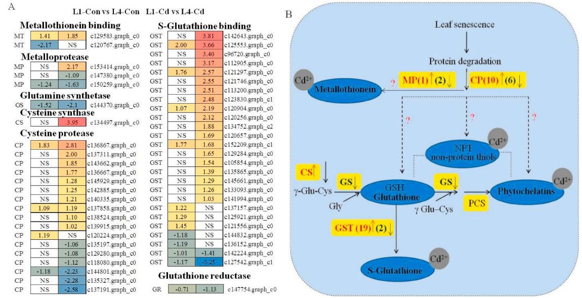 MT(金屬硫蛋白)是一組金屬結(jié)合蛋白,在金屬分配和穩(wěn)態(tài)中起著關(guān)鍵作用。1個(gè)上調(diào)基因(c129583.Graph_c0)和一個(gè)下調(diào)基因(c120767.graph_c0)編碼MT。Cd脅迫使上調(diào)基因的差異倍數(shù)比對照增加了23.8%,并完全抑制了表達(dá)下調(diào)的基因。結(jié)合Cd脅迫下MT含量的增加,作者的研究結(jié)果表明,MT-Cd結(jié)合可能在幼葉(L1)和衰老葉片(L4)的Cd解毒過程中發(fā)揮作用。半胱氨酸蛋白酶(CPs)是葉片衰老過程中負(fù)責(zé)蛋白水解活性的最豐富的酶。在該轉(zhuǎn)錄組中鑒定出17個(gè)編碼CP的基因。在對照組中,只有4個(gè)基因的表達(dá)有顯著差異。Cd脅迫顯著促進(jìn)CP表達(dá),有10個(gè)上調(diào)基因在Cd處理組的差異倍數(shù)高于處理組,Cd處理組的6個(gè)基因下調(diào)倍數(shù)低于對照組。然而,PC的蛋白水解活性是否與衰老葉片中Cd的積累有關(guān)尚不清楚。