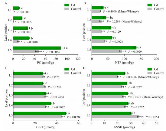 PC、GSH和NPT參與了超積累劑的Cd解毒機(jī)。Cd脅迫和對照組的植物螯合素(PCs)均隨葉片老化顯著增加。Cd處理顯著提高了各葉片PC含量,非蛋白硫醇(NPTs)含量也隨著葉片衰老而顯著增加,但隨葉片衰老的增加趨勢沒有變化。Cd處理顯著增加了衰老葉片(L4和L5)的谷胱甘肽(GSH)含量,但沒有提高幼苗和成熟苗的GSH含量。由此可以推斷,GSH、PC和NPT的增加及其與Cd的結(jié)合可能促進(jìn)了衰老葉片中Cd的積累。Cd處理顯著增加了幼葉和成熟葉的氧化谷胱甘肽(GSSH)含量(L1和L2),但降低了衰老葉(L5)的GSSH含量。由于氧化后的谷胱甘肽(GSSH)可被還原為還原型谷胱甘肽(GSH),還原性谷胱甘肽(GSH)可以通過GST進(jìn)一步催化GSH-Cd結(jié)合,GSSH向GSH的轉(zhuǎn)化與Cd在衰老葉片中的積累是一致的。