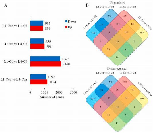 為了了解差異基因的功能,作者進(jìn)行了GO富集分析。四組的差異基因在節(jié)律過程、信號傳導(dǎo)和代謝過程等生物過程中都有20個(gè)豐富的分類。值得注意的是,與對照組相比,脫毒組的差異基因在幼葉和衰老葉中都有富集(L1-ConvsL1-Cd和L4-ConvsL4-Cd),但在幼葉和衰老葉的對照組和處理組中沒有明顯富集(L1-CdvsL4-Cd和L1-ConvsL4-Con)。