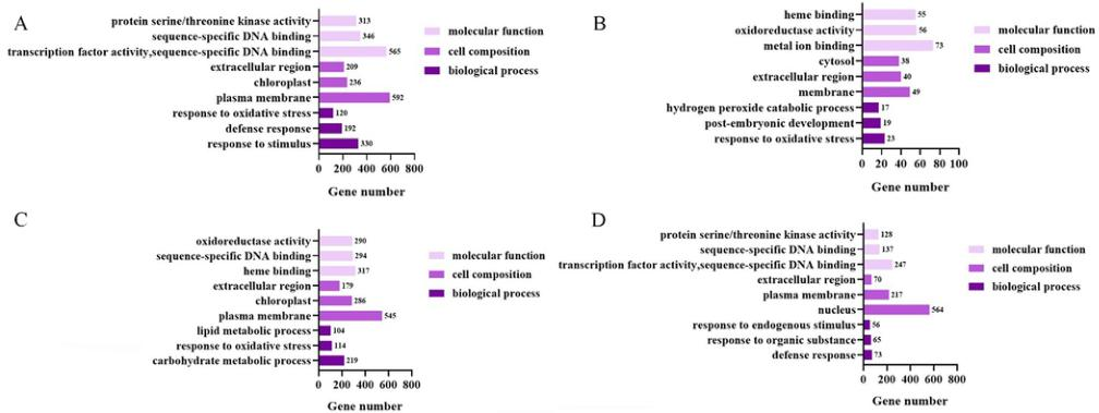 本研究對(duì)103份棉花材料在200mMCaCl2脅迫下萌發(fā),從103份棉花材料中篩選出一個(gè)極端抗Ca2+基因型(中9807,R)和一個(gè)Ca2+敏感基因型(CRI50,S)。然后將這兩份材料分別在0mMCaCl2和200mMCaCl2中發(fā)芽5天,然后取樣進(jìn)行轉(zhuǎn)錄組測序。形態(tài)學(xué)和生理學(xué)分析表明,在R中特異表達(dá)的PLR2可能通過促進(jìn)SDG的合成來增強(qiáng)棉花清除活性氧的能力。綜上所述,本研究提出了棉花應(yīng)對(duì)高鈣脅迫的適應(yīng)機(jī)制,有助于提高棉花的抗逆性。