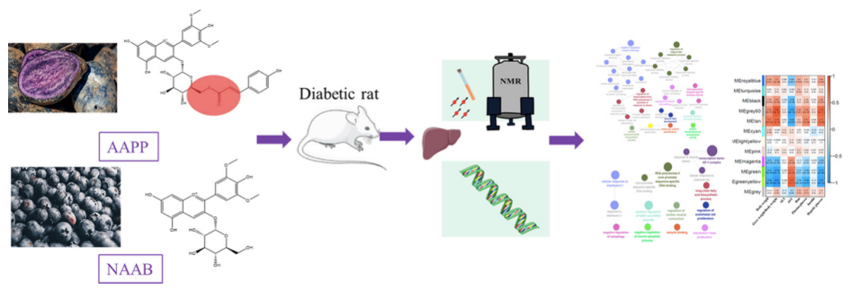 花色苷是植物中的一大類多酚化合物,目前已知是對氧化應(yīng)激、炎癥和能量穩(wěn)態(tài)有調(diào)節(jié)作用。已有報(bào)道發(fā)現(xiàn)花色苷具有抗糖尿病的療效?;ㄉ盏暮诵慕Y(jié)構(gòu)是花青苷,它可以糖基化形成非?;幕ㄇ嘬眨擒湛梢怎;笮纬甚;幕ㄇ嘬?。且最近有研究表明,與未?;幕ㄇ嘬障啾?,?;ㄇ嘬站哂懈玫姆€(wěn)定性和抗氧化活性。本研究利用全長轉(zhuǎn)錄組學(xué)和核磁共振代謝組學(xué)方法,比較了非?;王;ㄉ諏μ悄虿〈笫蟾闻K基因表達(dá)和代謝的影響。這是第一次綜合應(yīng)用這兩種強(qiáng)大的技術(shù)來研究肝臟基因表達(dá)和代謝產(chǎn)物的變化。