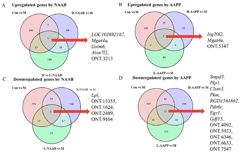 韋恩圖表明了不同分組之間上調(diào)和下調(diào)的DEG的交集,揭示了受NAAB和AAPP影響的特定基因(圖2A?D)。Gstm6與谷胱甘肽代謝、藥物代謝以及細(xì)胞色素P450對外源物質(zhì)的代謝有關(guān),在胰島素抵抗和糖尿病小鼠中均被報(bào)道下調(diào),并可能參與T2D的進(jìn)展。L-NAAB和H-NAAB均能恢復(fù)Gstm6的表達(dá)。與ND組和Con組相比,M組中有一個(gè)共同的基因被兩種花色苷提取物(NAAB和AAPP)上調(diào),即編碼N-乙酰氨基葡萄糖轉(zhuǎn)移酶GnT-4a的Mgat4a。在小鼠中,Mgat4a基因的遺傳失活導(dǎo)致葡萄糖轉(zhuǎn)運(yùn)蛋白2N-聚糖的錯(cuò)誤組裝,導(dǎo)致葡萄糖轉(zhuǎn)運(yùn)蛋白2和質(zhì)膜凝集素Galectin 9之間的相互作用失敗,導(dǎo)致葡萄糖轉(zhuǎn)運(yùn)蛋白2內(nèi)化,從而抑制葡萄糖攝取和葡萄糖刺激的胰島素分泌。還發(fā)現(xiàn)高脂飲食抑制了Mgat4a的表達(dá)。藍(lán)莓的非?;ㄉ蘸妥仙R鈴薯的?;ㄇ嘬斩际侨绱?。編碼脂蛋白脂肪酶的LPL在小鼠肝臟中過表達(dá),導(dǎo)致肝臟甘油三酯含量增加2倍,并導(dǎo)致胰島素抵抗,部分原因是對胰島素的反應(yīng)受損,抑制內(nèi)源性葡萄糖的產(chǎn)生。在本研究中,L-NAAB和H-NAAB都下調(diào)了ZDF大鼠高水平的LPL,這可能導(dǎo)致胰島素敏感性的改善。早期生長反應(yīng)基因-1(Egr1)可被胰高血糖素短暫激活,介導(dǎo)胰高血糖素調(diào)節(jié)的糖異生。AAPP降低Egr1,這可能與糖異生減少有關(guān)。