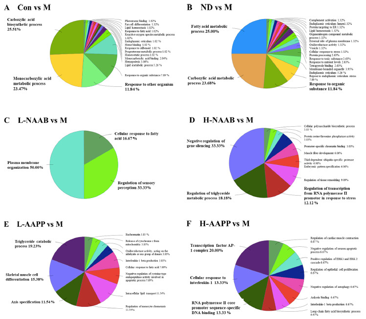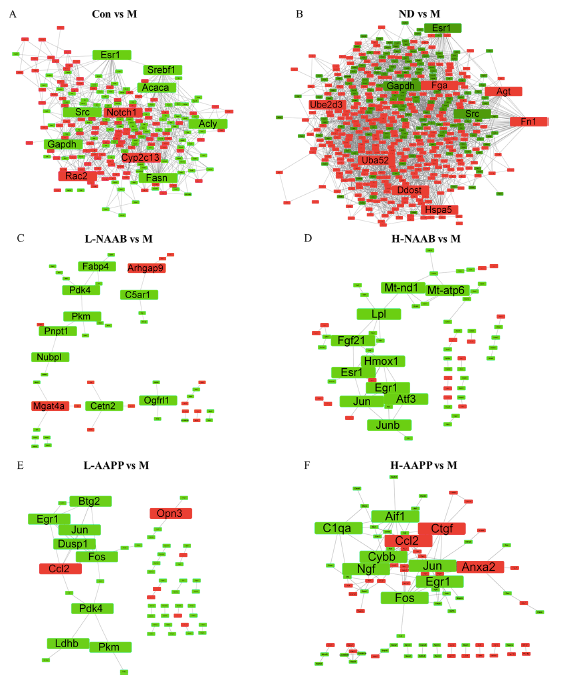 對不同分組中的DEGs進(jìn)行ClueGO分析,以生成按功能分組的注釋網(wǎng)絡(luò)圖(圖4A?F)。在CON/M差異分組的結(jié)果中,DEGs主要富集在羧酸生物合成過程、單羧酸代謝過程和對其他有機(jī)物的反應(yīng)過程。在ND/M分組差異結(jié)果中,脂肪酸代謝過程、羧酸代謝過程和對有機(jī)物的反應(yīng)過程是富集排名前3的功能分組。在ND/M和CON/M分組中,DEGs主要在單羧酸代謝過程、羧酸生物合成過程、脂肪酸代謝過程、脂肪代謝過程和對有機(jī)物的反應(yīng)過程相關(guān)的通路中富集。在L-NAAB/M分組差異結(jié)果中,DEGs組要與三個(gè)功能通過有關(guān):質(zhì)膜組織、感覺調(diào)節(jié)和細(xì)胞對脂肪酸的反應(yīng)。在H-NAAB/M差異結(jié)果中,DEGs主要富集于基因沉默的負(fù)調(diào)控、甘油三酯代謝過程的調(diào)控以及RNA聚合酶II啟動子對脅迫反應(yīng)的轉(zhuǎn)錄調(diào)控。在L-AAPP/M比較中,DEGs在甘油三酯分解代謝過程、骨骼肌細(xì)胞分化和軸規(guī)范方面都明顯富集。在H-AAPP/M差異結(jié)果中,發(fā)現(xiàn)轉(zhuǎn)錄因子AP-1復(fù)合體、細(xì)胞對白細(xì)胞介素-1的反應(yīng)以及RNA聚合酶II核心啟動子序列特異性DNA結(jié)合等通路顯著富集。