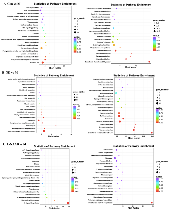 接下來,進(jìn)行了KEGG通路富集分析。氣泡圖展示富集最顯著的前20條通路(圖5A?F)。與M組相比,Con組上調(diào)的DEGs主要富集于以下通路:苯丙氨酸、酪氨酸和色氨酸的生物合成,亞油酸代謝,金黃色葡萄球菌感染,補(bǔ)體和凝血級聯(lián)反應(yīng),以及甲型流感病毒。ND組與M組相比,上調(diào)的DEGs主要富集在花生四烯酸代謝、金黃色葡萄球菌感染、移植物抗宿主病、吞噬小體等通路中,而ND組與M組相比上調(diào)的DEGs主要富集在以下通路:苯丙氨酸、酪氨酸和色氨酸的生物合成、亞油酸代謝、金黃色葡萄球菌感染、移植物抗宿主病、吞噬小體。在CON/M和ND/M比較中,下調(diào)的DEGs在相似的KEGG通路中富集:不飽和脂肪酸的生物合成、脂肪酸代謝、丙酮酸代謝、脂肪酸伸長、氧化磷酸化和碳代謝。對于花色苷處理組,L-NAAB組上調(diào)的DEGs在N-糖鏈生物合成通路中顯著富集。L-NAAB組下調(diào)的DEGs在泛酸和CoA生物合成通路中顯著富集。在H-NAAB、L-AAPP和H-AAPP組中沒有發(fā)現(xiàn)下調(diào)的DEGs有顯著富集的通路,在H-NAAB和L-AAPP組中上調(diào)的DEGs也沒有富集的通路。H-AAPP中上調(diào)的DEGs在補(bǔ)體和凝血級聯(lián)、不飽和脂肪酸和變形蟲病的生物合成等通路中顯著富集。