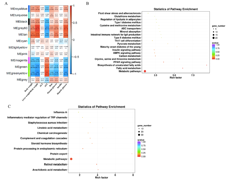 使用DEGs進(jìn)行WGCNA分析以確定共表達(dá)模塊及其與臨床特征的相關(guān)性。確定了12個(gè)共表達(dá)模塊,并與以前報(bào)道的各種臨床特征(體重、AST、ALT、血尿素氮、血糖和胰島素)相關(guān)(圖7A)。MEgery 60和MEtan模塊與體重、肝重/體重比、血糖、肝糖呈正相關(guān),與天冬氨酸轉(zhuǎn)氨酶呈負(fù)相關(guān)。MEgreen和MEgreenyellow模塊與體重、肝重/體重比、血糖、肝糖呈負(fù)相關(guān),與AST值呈正相關(guān)。接下來,對MEgrey60和MEtan模塊以及MEgreen和MEgreenyellow模塊中的基因進(jìn)行了KEGG通路富集分析。結(jié)果發(fā)現(xiàn)MEgrey60和MEtan中的基因富集的通路主要涉及脂類代謝(脂肪酸代謝、不飽和脂肪酸的生物合成、脂肪細(xì)胞脂解的調(diào)節(jié))、氨基酸代謝(甘氨酸、絲氨酸和蘇氨酸代謝、半胱氨酸和蛋氨酸代謝、谷胱甘肽代謝)、糖尿病(青少年成熟期糖尿病、II型糖尿病、I型糖尿病、胰島素信號通路)(圖7B)。MEgreen和MEgreenyellow模塊中的基因主要富集在花生四烯酸代謝、視黃醇代謝、代謝途徑、蛋白質(zhì)輸出、內(nèi)質(zhì)網(wǎng)蛋白質(zhì)加工、類固醇激素生物合成、補(bǔ)體和凝血級聯(lián)、亞油酸代謝以及TRP通道的炎癥介質(zhì)調(diào)節(jié)(圖7C)。