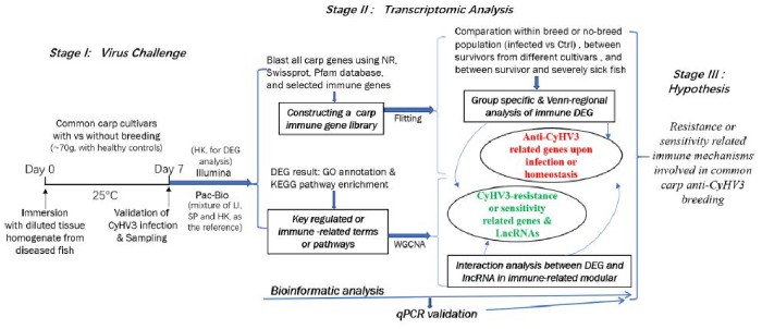 鯉魚(yú)皰疹病毒-3(CyHV-3)感染是鯉魚(yú)養(yǎng)殖的主要威脅,可導(dǎo)致鯉魚(yú)大量的死亡。CyHV-3可通過(guò)削弱宿主的免疫系統(tǒng)而使其死亡,導(dǎo)致其對(duì)病原微生物易感性,并可能在感染后6至10天內(nèi)出現(xiàn)發(fā)病和死亡。感染CyHV-3后存活下來(lái)的鯉魚(yú)可以抵抗這種病毒未來(lái)的感染。由于CyHV-3在鯉魚(yú)中存在潛伏期和持續(xù)性攜帶期,遺傳背景對(duì)于了解對(duì)病毒的耐藥性至關(guān)重要。德國(guó)鏡鯉品系G4是中國(guó)廣泛栽培的鯉魚(yú)品系,但因CyHV-3病毒引起高死亡率。然而目前在研究抗CyHV-3免疫機(jī)制的詳細(xì)免疫系統(tǒng)網(wǎng)絡(luò)方面,還缺乏系統(tǒng)的研究。最近的研究表明,lncRNAs在不同類型病原體感染時(shí)的廣泛差異表達(dá),表明lncRNAs在魚(yú)類免疫反應(yīng)中起著關(guān)鍵作用。然而,在CyHV-3感染期間,鯉魚(yú)體內(nèi)的特異性LncRNA對(duì)免疫反應(yīng)的調(diào)節(jié)尚未被研究。第三代測(cè)序(如PacBio)可以解碼比第二代測(cè)序方法(如Illumina)更長(zhǎng)的基因序列,包括mRNA和非編碼RNA在內(nèi)的更高質(zhì)量的轉(zhuǎn)錄本組裝,可能提供對(duì)遺傳抗性機(jī)制的更詳細(xì)理解。在本研究中,為了揭示鯉魚(yú)抗CyHV3育種中涉及的免疫機(jī)制,使用圖1所示的策略,對(duì)CyHV-3激發(fā)期間的mRNA和長(zhǎng)非編碼RNA(lncRNA)進(jìn)行了整合轉(zhuǎn)錄組學(xué)分析。對(duì)來(lái)自繁殖品系或非繁殖品系的存活鯉魚(yú)和健康對(duì)照鯉魚(yú)的免疫相關(guān)轉(zhuǎn)錄本進(jìn)行了分析。