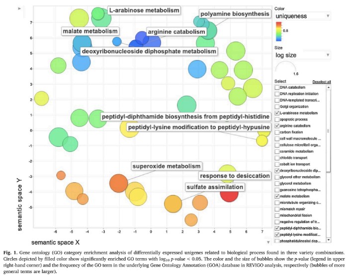 對差異表達的基因進行 GO 富集分析。在生物過程類別中,主要與超氧化物酶代謝,精氨酸分解代謝,蘋果酸代謝和多胺生物合成有關(guān)。分子功能類別中的富集類別為硫氧還蛋白活性,固醇結(jié)合,L-蘇氨酸氨裂解酶活性和富馬酰乙酰乙酸酶活性。在細胞成分類別中,主要為高爾基體堆積,小亞基加工體,細胞外間隙和 1,3-β-D-葡聚糖合酶復(fù)合體。
