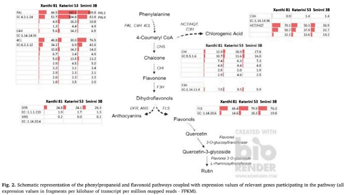 查爾酮合酶(CHS)是類黃酮生物合成中的關(guān)鍵酶。研究者發(fā)現(xiàn)兩個 CHS基因在三個煙草品種的葉片中均低表達,因為 CHS 主要在花中組成性表達,但其表達主要是由非生物/生物脅迫誘導(dǎo)的。注釋為 CHS-1B 或 CHS2 的Nitab4.5_0002920g0060.1 在’Katerini 53’和’Xanthi 81’中略有上調(diào),但第二個注釋為 III 型聚酮化合物合酶(NCBI:XP_016446648.1)差異很小。所有 CHI 基因也僅以低水平表達,在鑒定的結(jié)果中 F3H 也沒有差異。另一方面,鑒定了兩個參與黃酮醇形成的 FLS 基因。FLS1(Nitab4.5_0005357g0020.1)(NCBI:LOC107794305)的表達最高,而 NtFLS(Ni-tab4.5_0006276g0010.1)的表達低得多。這兩個基因在品種之間沒有差異表達。還檢測到有助于花色苷生物合成的基因,例如 DFR 和 ANS。DFR 中第一個僅適度表達,另外一個沒有差異。ANS(Nitab4.5_0003274g0110.1)幾乎未表達(圖 2)。蘆丁是一種黃酮醇糖苷,在花青素途徑生物合成,其中包括黃酮醇 3-O-葡萄糖基轉(zhuǎn)移酶和黃酮醇 3-O-葡萄糖苷胰島素轉(zhuǎn)移酶。結(jié)果表明低表達的 4 種黃酮醇 3-O-糖基轉(zhuǎn)移酶和 2種黃酮醇 3-O-糖苷胰島素轉(zhuǎn)移酶在“Smirrni 3B”和“Xanthi 81”比“Katerini 53”中表達更高、更多。