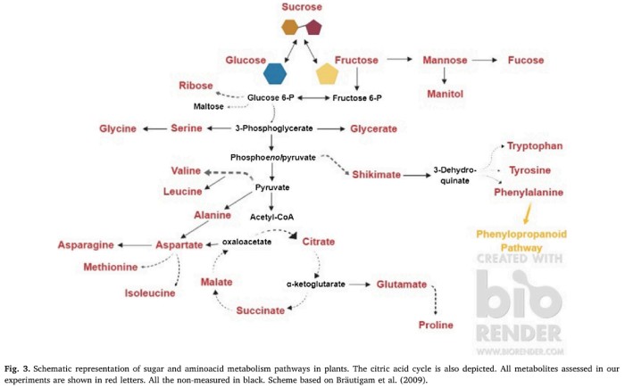 采集“Katerini 53”,“Xanthi 81”和“Smirrni 3B”葉片樣品,并使用氣相色譜GC-MS 和 LC-MS / MS 方法進行代謝分析?;蛐皖A(yù)先鑒定為不同的色譜模式,共有 78 種代謝化合物(包括糖,氨基酸,有機酸)差異積累,如圖 3 所示。詳細的非靶向 GC-MS 代謝組學(xué)分析用于鑒定煙葉中產(chǎn)生的大多數(shù)主要代謝產(chǎn)物。在本研究中,所測得的最豐富的可溶性糖是果糖,葡萄糖,半乳糖和蔗糖。在果糖和蔗糖中檢測到統(tǒng)計學(xué)差異;“Katerini 53”中的果糖含量更高,而“Smierni 3B”中的蔗糖含量更高。“Katerini 53”與其它兩個品種相比葡萄糖和半乳糖水平較高,差異無統(tǒng)計學(xué)意義。在可溶性醇中,兩個豐富的代謝產(chǎn)物是山梨糖醇和肌醇,但在品種之間未檢測到統(tǒng)計學(xué)上的顯著差異。這三個品種中的蘋果酸含量沒有任何統(tǒng)計上顯著不同?!癤anthi 81”葉子的氨基酸含量最高,但谷氨酸和 γ-氨基丁酸(GABA)除外。GABA 和脯氨酸是煙葉中的主要氨基酸。與其他兩個品種相比,“Smirrni 3B”中的 GABA 水平明顯更高。’Smirrni 3B’和’Xanthi 81’中的脯氨酸水平較高,而“Katerini 53”的脯氨酸水平最低。在“Smirrni 3B”中檢測到了高濃度的甘氨酸和絲氨酸這兩種必需氨基酸。煙草生物堿在根部合成,然后轉(zhuǎn)運到葉片。生物堿、尼古丁與植物抗草食動物防御有關(guān)。在三個品種中檢測到的尼古丁濃度在統(tǒng)計學(xué)上有顯著差異。結(jié)果表明,“Xanthi 81”的尼古丁濃度最高,而“Smirrni 3B”的尼古丁濃度最低。與“Katerini 53”相比,“Xanthi 81”中腐胺的含量有所降低,但其濃度仍高于“Smirrni 3B”。鑒定了所有擬參與煙草中尼古丁生物合成的相應(yīng)基因,但僅發(fā)現(xiàn)少數(shù)幾個在成熟葉片中表達。然而,基因 XS 和 QPT(三分之二)在“Xanthi 81”中表達較高。與其它兩個品種相比,這與“Xanthi 81”葉片中較高的尼古丁含量相關(guān),這表明它可能是遺傳控制的。