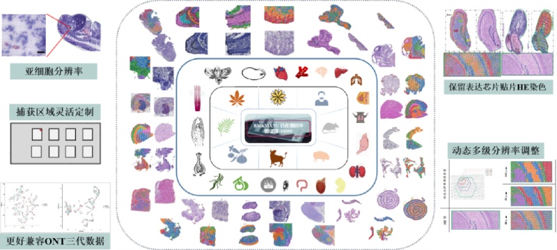 百創(chuàng)智造自主研發(fā)的基于微孔微珠的亞細(xì)胞級分辨率空間轉(zhuǎn)錄芯片BMKMANU S1000,包含1~8個捕獲區(qū)域,可在亞細(xì)胞分辨率水平上,檢測完整組織切片中的原位基因表達(dá)信息,實現(xiàn)組織結(jié)構(gòu)的精細(xì)解讀。同時支持100μm~4,8μm多級分辨率的調(diào)整,并且支持HE染色,能更好觀察組織病理形態(tài),目前已在上百例組織樣本中得到性能驗證。