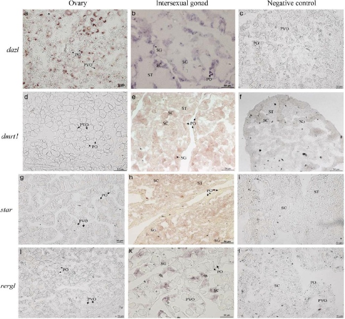 用原位雜交(ISH)技術(shù)分析了不同性腺階段性相關(guān)基因(dazl、Dmrt1、star、rergl)的定位。dazlmRNA僅限于斜帶石斑魚的雌性和雄性生殖細胞(卵母細胞、SG和SC)表達(圖9a、b),結(jié)果表明dazl是一種生殖細胞標(biāo)記物,在睪丸中高表達,這與其他物種中dazl的表達一致。在自然雌性的卵巢中未檢測到Dmrt1信號(圖9d)。性逆轉(zhuǎn)后期的性腺有豐富的雄性生殖細胞SG、SC和ST,帶有dmrt1陽性信號,而卵母細胞沒有dmrt1信號(圖9e),因此dmrt1可以被認為是斜帶石斑魚的生殖細胞標(biāo)記。star作為合成類固醇激素途徑中的限速酶,其在雄性斜帶石斑魚的睪丸中特異表達,而在卵母細胞中未檢測到star信號(圖9g)。此外,發(fā)現(xiàn)starmRNA在SG、SC和ST中表達(圖9h)。rerglmRNA僅在雄性生殖細胞中檢測到(圖9j,k),這與RT-qPCR結(jié)果一致,暗示其在性別調(diào)節(jié)中的潛在作用。dazl、dmrt1、star和rergl的雜交探針作為對照實驗顯示性腺中沒有信號(圖9c、f、I、l)。