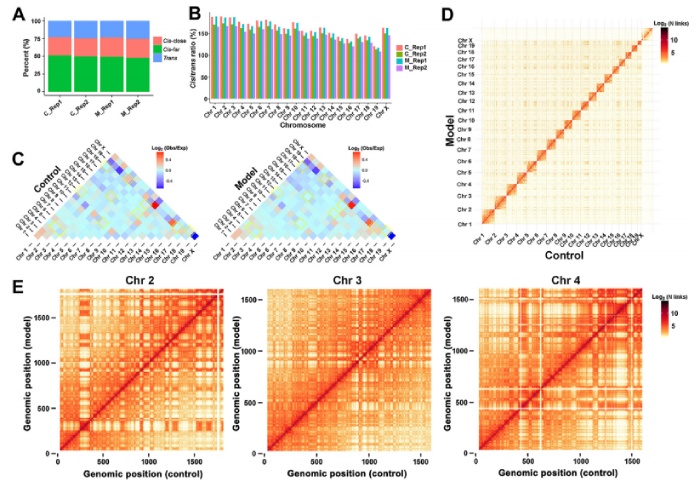 為了獲得三維染色質(zhì)構(gòu)象圖,作者對肝臟樣本的Hi-C文庫進(jìn)行了測序,每組總共獲得超過477 Gb的數(shù)據(jù)。在去除PCR重復(fù)位點后,每個樣本獲得了超過8.02億對有效Hi-C數(shù)據(jù),測序深度為68.56%和68.96%,能夠以10 kb分辨率檢查C組和M組的相互作用。順反式相互作用的比例顯示,約四分之三的相互作用發(fā)生在染色體內(nèi),四分之一的相互作用發(fā)生在染色體間質(zhì)(圖2A)。,這個頻率可以揭示染色體在基因組中的相互作用強(qiáng)度和染色體在細(xì)胞核中的相對位置。染色體之間的相互作用頻率熱圖如圖2C所示。通過熱圖顏色由對照組的藍(lán)色變?yōu)镹AFLD組的淺紅色,可以發(fā)現(xiàn)染色體Chr2與Chr5之間相互作用頻率的差異,提示NAFLD組兩染色體之間距離較近,相互作用較強(qiáng)。相比之下,觀察到的顏色從紅色變?yōu)樗{(lán)色,表明NAFLD組染色體之間的空間距離更遠(yuǎn),相互作用更弱,如Chr 7和Chr 11之間的相互作用。將各組的兩個Hi-C庫結(jié)合起來,進(jìn)行對照組與模型組的對比分析。根據(jù)任意兩個bin之間覆蓋的Hi-C讀對的歸一化相互作用信號強(qiáng)度,繪制全基因組相互作用矩陣(圖2D),染色體內(nèi)相互作用矩陣如圖所示。