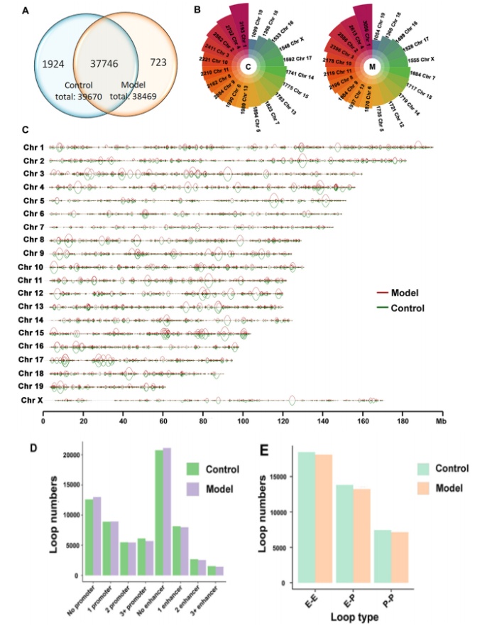 除了短程染色質(zhì)相互作用外,3D基因組組織中的遠(yuǎn)程環(huán)帶來了兩個線性分離的位點之間的物理接近。作者通過Hi-C接觸矩陣使用改進(jìn)的HICCUP方法注釋染色質(zhì)環(huán),分辨率為10 kb。結(jié)果顯示,與NAFLD發(fā)展相關(guān)的環(huán)的總數(shù)減少(從39,670到38,469,圖5A),而環(huán)的大小沒有變化(環(huán)的中位數(shù)長度為70 kb,支持信息圖S6A。每條染色體的環(huán)分布如圖5B和C所示,Chr 1上的環(huán)分布*多,對照組和模型組分別有3193個和3099個環(huán)(圖5B)。