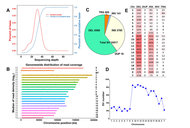 ONT測序用于對NAFLD小鼠基因組變異進(jìn)行測序。經(jīng)過質(zhì)量控制,從對照和模型樣本(每組n z3個)中獲得643.97 Gb清潔數(shù)據(jù),平均清潔數(shù)據(jù)量為107.33 Gb。N50值為9.89 kb,讀取的平均長度大于6.95 kb(支撐信息表S14)。根據(jù)參考基因組,每個樣本的映射率均在99.04%以上。測序深度和讀取覆蓋率的分布顯示了可接受的測序隨機(jī)性(圖6A和B,支持信息圖。S7B和S8)。實驗組中,有381個deg與差異sv重疊,其中與DEL重疊201個deg,與INS重疊99個deg,與INV重疊188個deg(輔助信息表S17)?;诨蚬δ?,作者發(fā)現(xiàn)14個svv影響的DEGs參與脂質(zhì)運輸和代謝(Acaca、Acsl5、Cbr3、Ces1f、Ces1g、Cryl1、Dgka、Dgkb、Dgkk、Idi1、Nlgn1、Nlgn3、Sugct和Hao2), 8個svv影響的DEGs與能量產(chǎn)生和轉(zhuǎn)換相關(guān)(Bckdhb、Me1、Hao2、Mt-co3、Mt-nd4、Nnt、Slc1a1和Slc1a2)。一些sv影響的DEGs與NAFLD相關(guān),這些結(jié)果暗示SVs通過影響基因調(diào)控和染色質(zhì)組織參與NAFLD的發(fā)展。