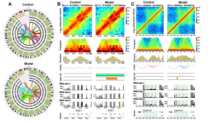 非酒精性脂肪性肝病(NAFLD)的3D基因組和基因組變異在很大程度上是未知的,盡管它們在細(xì)胞功能和生理過程中起著關(guān)鍵作用。在正常和NAFLD小鼠的肝臟上進(jìn)行高通量染色體構(gòu)象捕獲(Hi-C)、ONT測序和rna測序(RNA-seq)測定。生成高分辨率3D染色質(zhì)相互作用圖,通過Hi-C檢測不同的3D基因組層次結(jié)構(gòu),包括A/B區(qū)室、拓?fù)湎嚓P(guān)結(jié)構(gòu)域(TADs)和染色質(zhì)環(huán),并檢測結(jié)構(gòu)變異(SVs)和拷貝數(shù)變異(CNVs)的全基因組測序。在正常和NAFLD小鼠間,發(fā)現(xiàn)了基因組中數(shù)千個區(qū)域在3D染色質(zhì)組織和基因組重排方面的變化,并揭示了基因調(diào)節(jié)異常經(jīng)常伴隨這些變化。在NAFLD中發(fā)現(xiàn)了候選靶基因,受基因重排和空間組織破壞的影響。作者的數(shù)據(jù)為NAFLD研究提供了高分辨率的三維基因組相互作用資源,揭示了遺傳重排、空間組織破壞和基因調(diào)控之間的關(guān)系,并確定了與NAFLD發(fā)病機(jī)制中這些變異相關(guān)的候選基因。這些新發(fā)現(xiàn)為NAFLD的發(fā)病機(jī)制提供了新的見解,并為NAFLD的治療提供了新的概念框架。