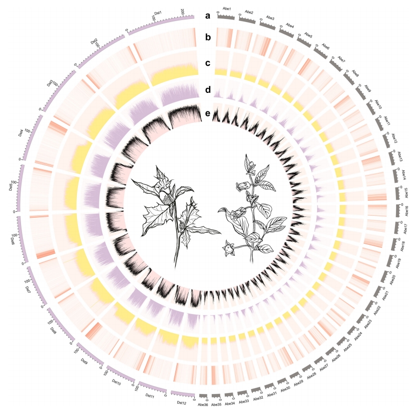 本研究基于三代PacBio、Nanopore、Hi-C等技術(shù)成功構(gòu)建了2個(gè)具有代表性的產(chǎn)mTAs的物種:顛茄和曼陀羅染色體水平基因組。研究結(jié)果表明:它們?cè)谇芽浦械挠H緣關(guān)系較遠(yuǎn),但這兩個(gè)物種產(chǎn)生mTAs的生物合成途徑是保守的。保守的基因簇和基因重復(fù)構(gòu)成了TAs在該科中廣泛分布的基礎(chǔ),導(dǎo)致mTAs的分支基因可能在茄科早期祖先物種中進(jìn)化,但在大多數(shù)譜系中都已丟失,顏茄和曼陀羅是例外。此外,研究還鑒定了一種細(xì)胞色素P450,它能將莨若堿修飾成去甲莨菪堿。此研究結(jié)果為了解茄科植物中TAs的生物合成提供了基因組學(xué)基礎(chǔ),并將有助于通過(guò)合成生物學(xué)方法進(jìn)行mTAs的生物技術(shù)生產(chǎn)。