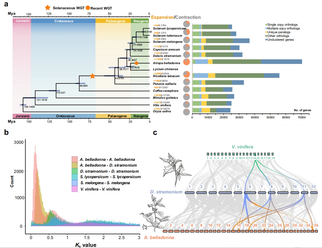 作者利用顛茄和曼陀羅,以及8個(gè)茄科物種和4種其他被子植物的207個(gè)單拷貝基因進(jìn)行系統(tǒng)發(fā)育分析。結(jié)果表明:顛茄和枸杞屬于一個(gè)分支,而曼陀羅、辣椒、茄子、番茄和馬鈴薯屬于另一個(gè)分支,估計(jì)矮牽牛在約43Mya(33-56Mya)從茄科物種分化而來(lái),曼陀羅在約28Mya(23-37Mya)由順茄和枸杞組成的分支分化而來(lái),而顛茄在大約24Mya(18-31Mya)從枸杞分化而來(lái)。Ks分析顯示,茄科物種與其他高等雙子葉植物共享較古老的伽馬古多倍體事件。對(duì)顛茄、曼陀羅和葡萄進(jìn)行基因組共線性分析,對(duì)于葡萄基因組的各個(gè)區(qū)域,通常在曼陀羅基因組中能鑒定出3個(gè)與之匹配的區(qū)域,并且在顛茄和曼陀羅之間也有相似的現(xiàn)象。