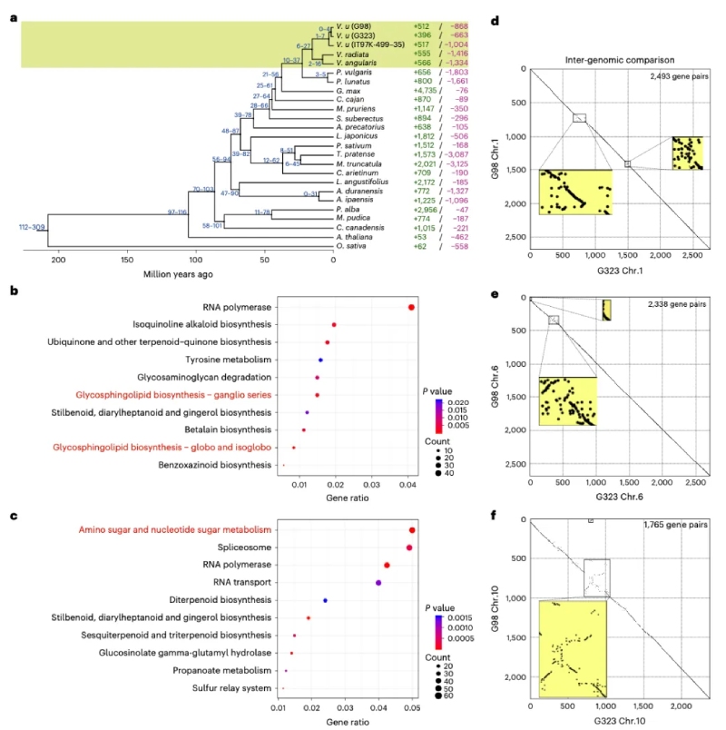 對(duì)25個(gè)物種進(jìn)行系統(tǒng)進(jìn)化樹分析顯示豇豆與赤小豆(V. angularis)和綠豆(V. radiata)親緣關(guān)系較近,它們的分化時(shí)間大約在6-27百萬年前(圖2a),這與之前的報(bào)道一致?;蚣易宸治霭l(fā)現(xiàn)G98中有512個(gè)家族發(fā)生了顯著擴(kuò)張,這些擴(kuò)張的基因家族在參與膜組織的鞘糖脂代謝途徑顯著富集,可能與菜用豇豆的豆莢發(fā)育相關(guān)。相反,G323擴(kuò)張基因在氨基酸糖和核苷酸糖代謝、硫代葡萄糖苷-谷氨酰水解酶和半乳糖代謝等能量產(chǎn)生和轉(zhuǎn)化途徑中顯著富集(圖2b, c),這可能與糧用豇豆更高的碳水化合物積累和防御反應(yīng)有關(guān)。