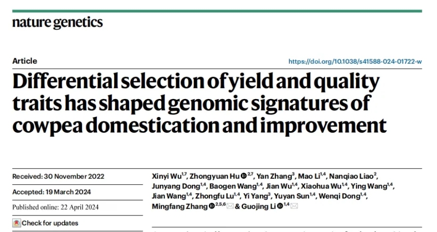 參考文獻(xiàn):Wu, X., Hu, Z., Zhang, Y. et al. Differential selection of yield and quality traits has shaped genomic signatures of cowpea domestication and improvement. Nat Genet (2024).