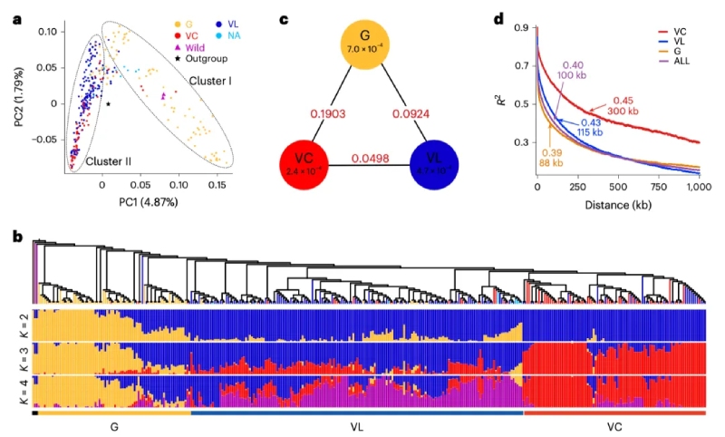 對(duì)三個(gè)亞群的核苷酸多樣性(π)和群體差異(Fst)進(jìn)行分析(圖3c)。G組(π = 0.0007)核苷酸多樣性顯著高于VL組(π = 0.00047)和VC組(π = 0.00024)。G-VC(0.1903)和G- VL(0.0924)的FST值均高于VC-VL(0.0498)。此外,與VL和VC組相比,該組的連鎖不平衡衰減更快,表明糧用豇豆的遺傳重組程度更高(圖3d)。