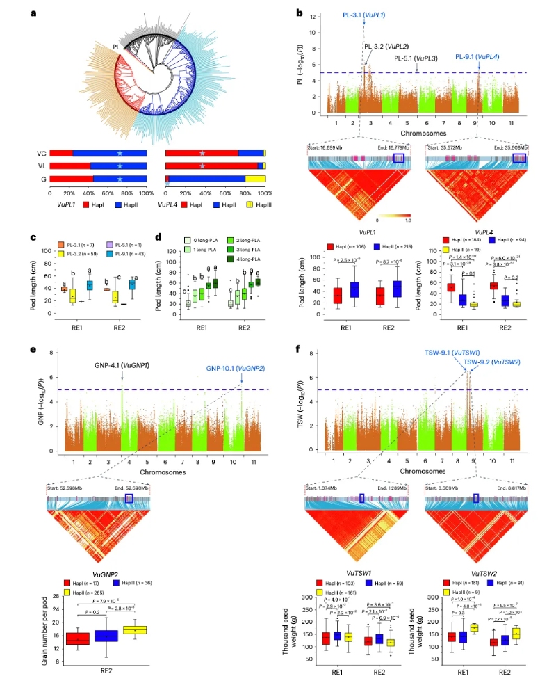 產(chǎn)量相關(guān)基因和品質(zhì)相關(guān)基因在3個(gè)亞群體(G、VL和VC)中的多態(tài)性和分布揭示了豇豆表型分化的遺傳基礎(chǔ)。莢長(PL)、單莢粒數(shù)(GNP)和千粒重(TSW)是影響豇豆產(chǎn)量的重要因素,G亞群的PL通常比VL和VC亞群的PL短得多(圖5a)。GWAS分析挖掘到與這3個(gè)性狀相關(guān)的位點(diǎn)和候選基因,并對(duì)候選基因單倍型及其表達(dá)分析,發(fā)現(xiàn)PL差異可能是由于VuPL1-HapII 和 VuPL4-HapI (圖5b) 在豇豆馴化和改良過程中強(qiáng)烈選擇引起的。在重組自交系(RIL)群體中進(jìn)一步驗(yàn)證了VuPL1和VuPL4的功能,發(fā)現(xiàn)VuPL1似乎比VuPL4在該群體中具有更強(qiáng)的作用。同時(shí)基因表達(dá)分析發(fā)現(xiàn)WAKs基因可能以劑量/轉(zhuǎn)錄依賴的方式導(dǎo)致PL差異。糧用豇豆的GNP也通常比菜用豇豆的低,可能是VuGNP2-HapIII這一有利單倍型引起的(圖5e)。TSW則可能與VuTSW1和VuTSW2基因的有利單倍型有關(guān)(圖5f),其功能也分別在RIL群體和F2群體中得到進(jìn)一步驗(yàn)證。
